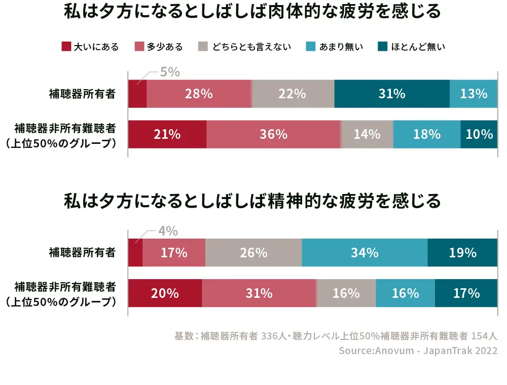 補聴器が健康や認知症などにどのような影響をもたらすのか、補聴器所有者と非所有者を比べると前者の方が、肉体的にも、精神的にも夕方の疲労度合いが小さいという結果になりました。