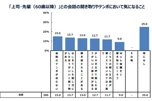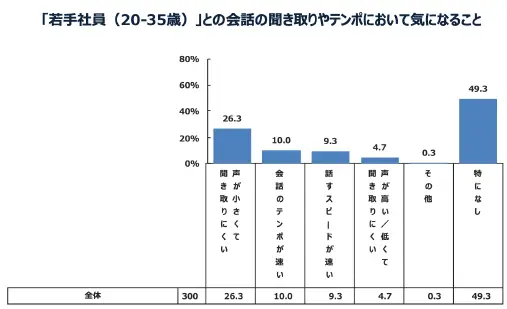 一方、ベテラン社員に対し、若手社員と話す際に「きこえ」に関して気になる点を聞いたところ、「声が小さくて聞き取りにくい」が26.3%で最も多く、次いで「会話のテンポが速い(10%)」、「話すスピードが速い(9.3%)」が挙げられました。 このことから、会話のズレは話題や価値観といった精神的なものだけでなく、互いの声の大きさや会話スピードといった物理的な要因も、スムーズなコミュニケーションを阻害している大きな要因であることが明らかになりました。