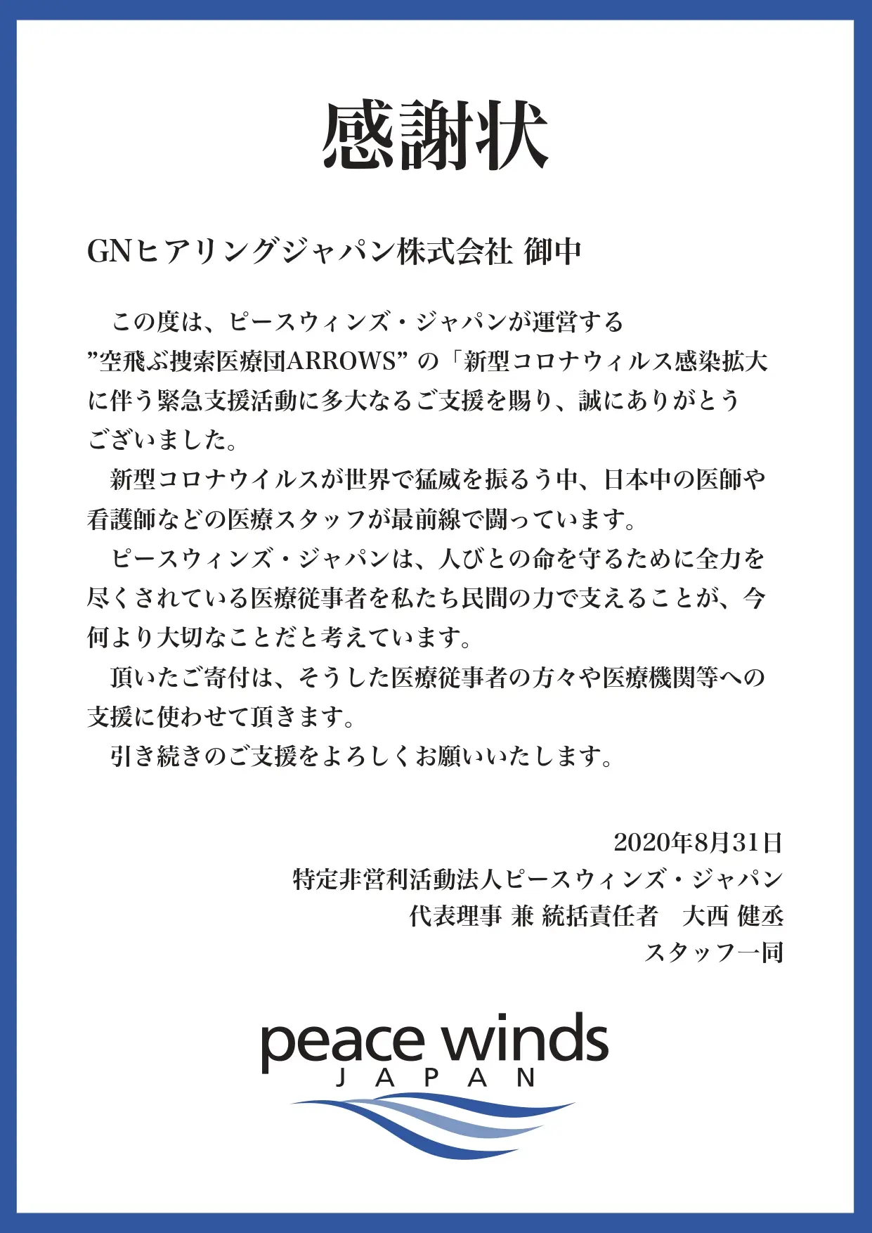 弊社では2020年6月~7月末までの2ヶ月間、リサウンド・リンクス3Dの4シリーズ、全モデルを特別価格で販売する「きこえ応援 補聴器キャンペーン」を実施致しました。その売上金の中から約300万円を特定非営利活動法人ピースウィンズ・ジャパンの新型コロナウイルス緊急支援事業に寄付し、感謝状をいただきました。