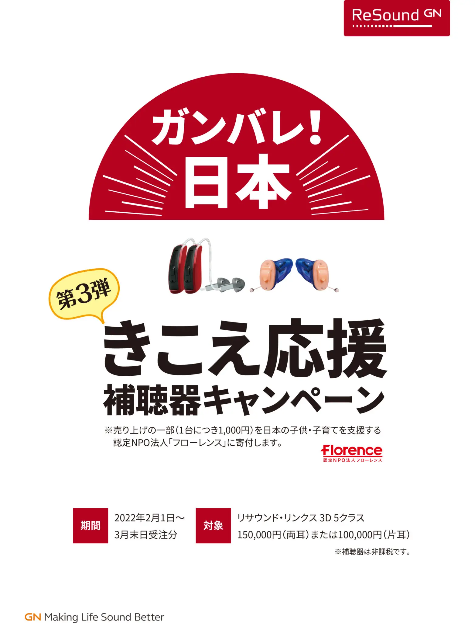 キャンペーン期間中に対象器種「リサウンド・リンクス3D 5クラスの全モデル(通常価格:両耳36万円~38万円、片耳18万円~19万円)」を両耳購入の場合は15万円、片耳購入の場合は10万円の一律価格で販売いたします。