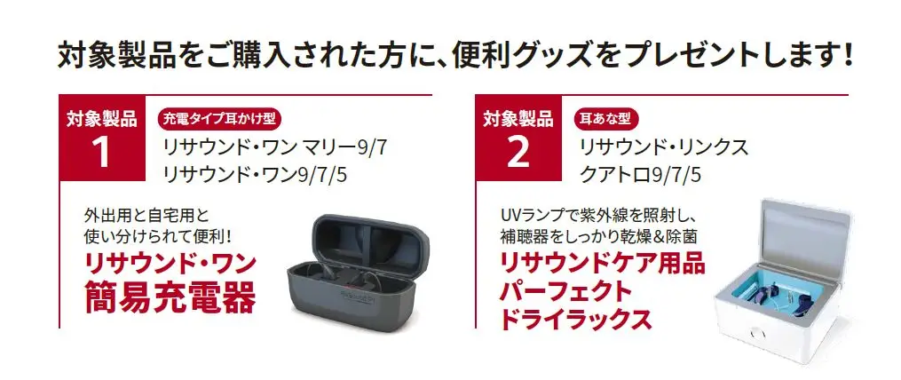 この度、昨年大好評のうちに幕を閉じた「ガンバレ!日本 きこえ応援補聴器キャンペーン」の第2弾を開催いたします。今回は、お客様の生活でご活用いただける便利グッズをプレゼントします。対象商品、便利グッズの詳細は以下をご覧ください。