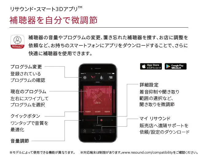 特徴:リサウンドの最新スマート補聴器で、雑音の中でも会話が聞こえやすく、補聴器を取り外さなくてもスマートフォンからワイヤレスで補聴器の設定変更が可能。スマートフォンでの通話や音楽の視聴もワイヤレスヘッドホンの感覚で聞くことができます。音質にもこだわり、これまでにない豊かな音を実現します。