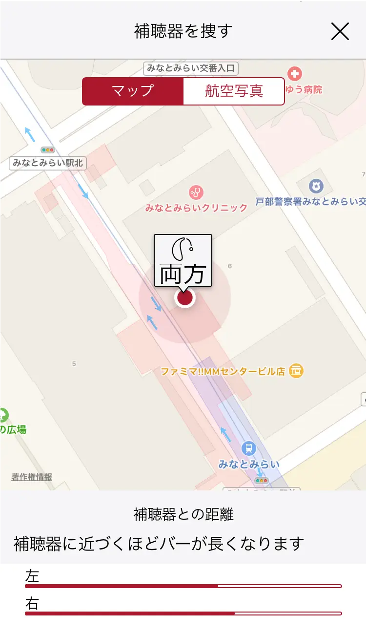 補聴器が見つからない、どこかに置き忘れたという際に、捜す手助けをします。補聴器とアプリの通信が最後に切断された場所と時刻を地図上に表示、アプリが近距離で補聴器を検出した際は、補聴器との距離をバーで表示します*。バーの長短で補聴器との遠近を確認できます。