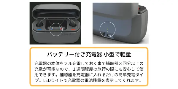 また、補聴器の種類によって、持ち運び充電ができる小型の非接触式タイプの充電器もあります。