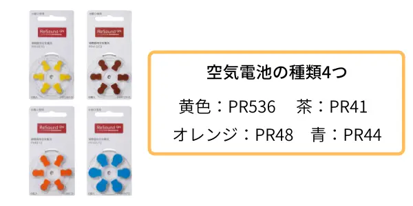 空気電池の種類は4つあり、シールに色がついているので簡単に見分ける事ができます。購入する時に、自分の補聴器に合う種類がどれかを確認するようにしてください。