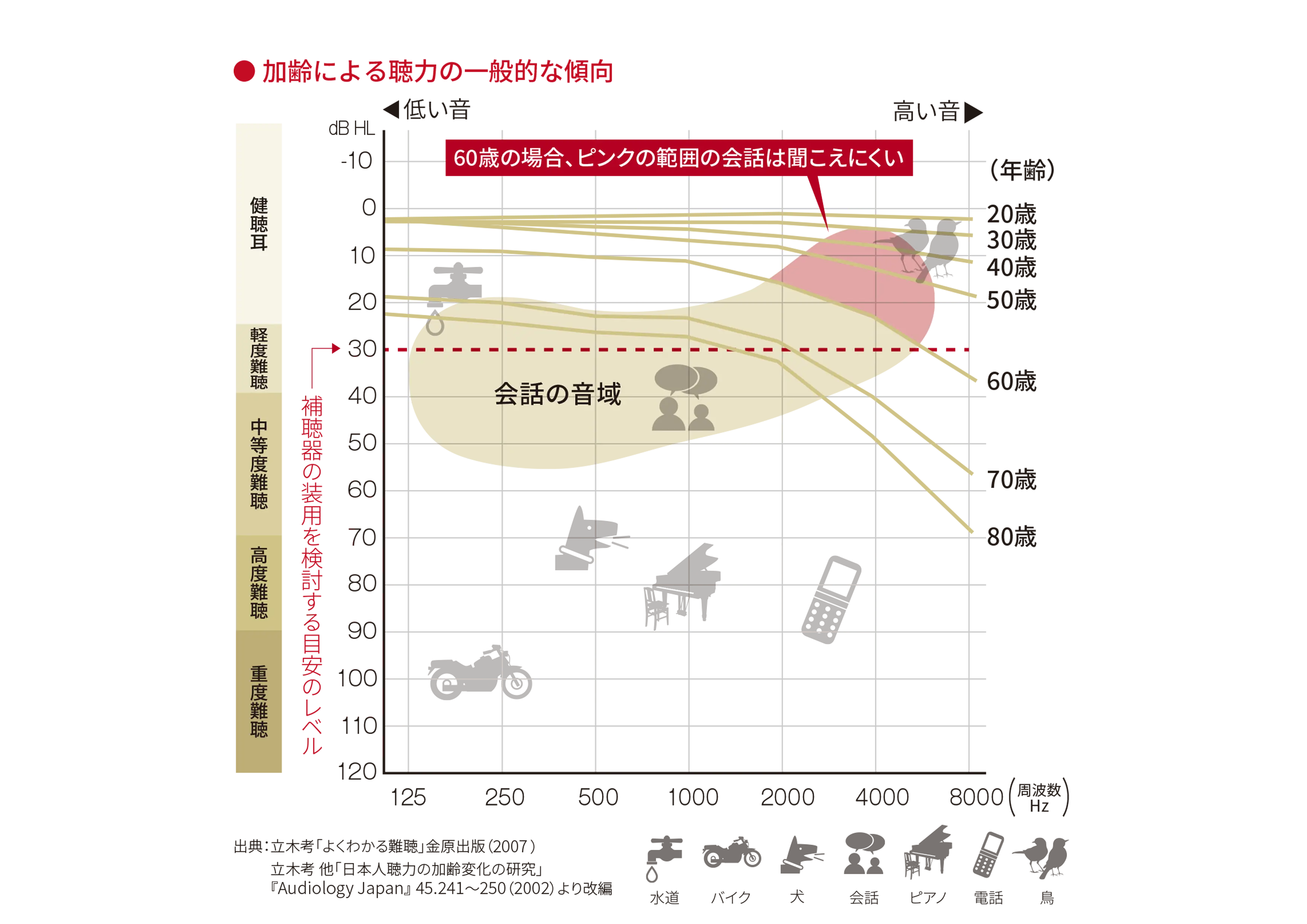 誰しもが経験する加齢性難聴は、年齢と共に下の図のように高い音からきこえにくくなります。