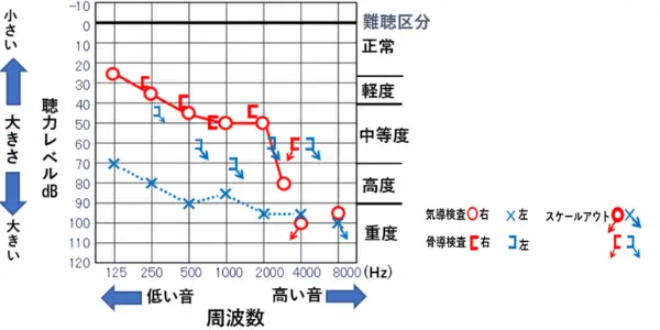 オージオグラムは、高さごとにどのくらいの音量だと聞こえるのかを知る事ができます。難聴の程度を把握する為に非常に重要になります。