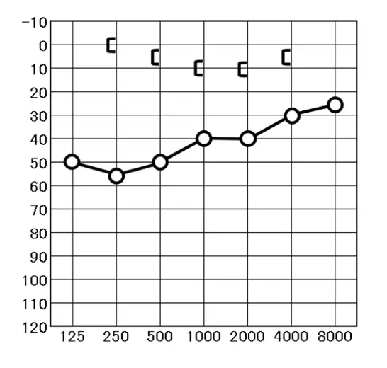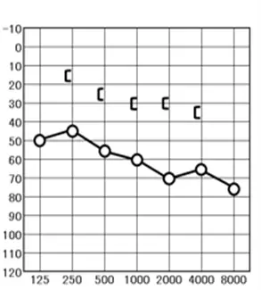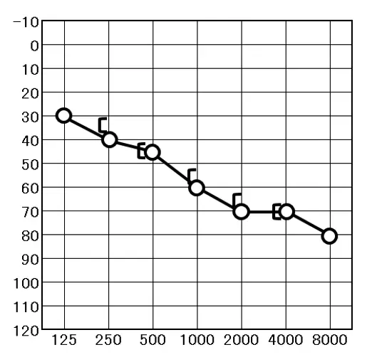 〇印は気導検査の右耳、×印は左耳の聞こえです。カギカッコの印は骨導検査の結果を表しています。[が右耳、]が左耳の結果を表しています。難聴の種類をみるために必要な検査です。
