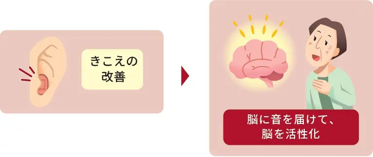 補聴器で聞こえを補う為には、聴力に応じた補聴器を選択し適切な調整とトレーニングを行う事が必要です。補聴器からの音によって脳を活性化する事が可能です。会話は、耳で言葉を聞き脳で考えて言葉を発するというサイクルです。