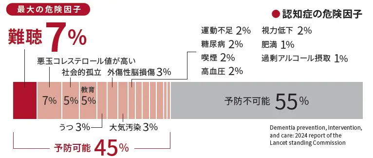 ここで注目したい点は、2024年医学雑誌ランセットが「認知症の45%は予防可能な14の要因により起こると考えられる。その中で、最大の危険因子が難聴(7%)」と発表しました。