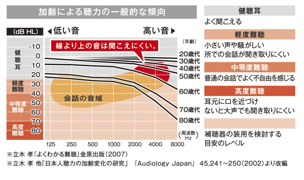 さらに年齢を重ねるにつれて難聴も進行してきます。加齢性難聴の特徴として、