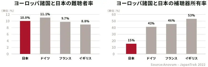 日本では、難聴者を自覚している人の割合は10.0%と諸外国と変わらないのですが、実際に補聴器を使用している人は海外と比較すると15.2%と非常に低いです。また、難聴を自覚している人のうち、4割は耳鼻咽喉科の医師やかかりつけ医に相談したという報告もありました。しかし、難聴を自覚していても6割は放置しているという事です!