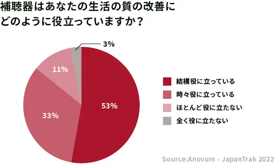 「補聴器はあなたの生活の質の改善にどのように役立っていますか?」という質問項目に対しては、「結構役に立っている」「時々役に立つ」を合わせて86%でした。
