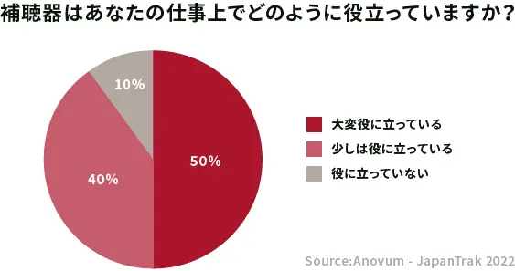 次に、補聴器の有用性について見てみます。「補聴器はあなたの仕事上でどのように役立っていますか?」という質問項目がありました。この項目は、仕事を持っている補聴器装用者に聞いたもので、90%の人が仕事上で役に立っていると回答しています。