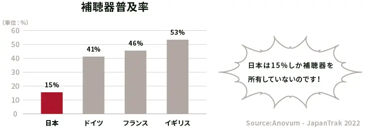 イギリスは53%、フランス46%、ドイツ41%と高いですが、日本は極端に少ないのです。補聴器の普及については、健康保険で補聴器を支給される国もある為、助成制度の有無が関係しているかもしれません。それ以外には、補聴器のイメージも関係しているかもしれません。昔に比べて補聴器は進化していますが、「補聴器は自分にはまだ早い」「年寄りくさい」「雑音ばかりで役に立たない」といったネガティブなイメージを持たれているのかもしれません。