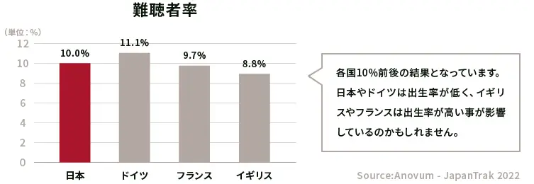 日本では2022年に行われた1万4061人を対象に調査が行われ、そのうち1406人が難聴者でした。これは、あくまで自己申告による難聴の集計であり、実際は自覚していない難聴者もいると思われる為、もっと多くの難聴者が存在すると考えられます。