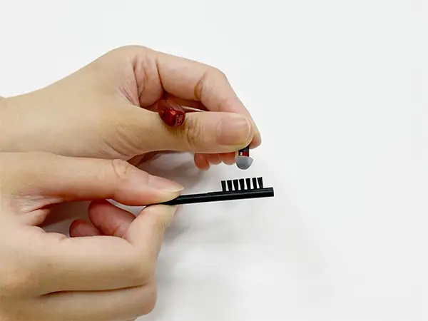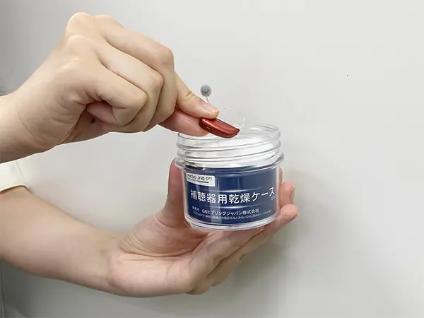 補聴器をお使いになった後は、製品に付属している耳あか掃除ブラシで耳あかを取り除き、乾いた布で全体を軽く拭いてください。その際に、取り除いた耳あかが本体の中に入り込まないよう、清掃面を下に向けることが大切です。補聴器は汗や湿気に弱いため、装用後は必ず電池を抜いて乾燥ケースに一晩入れておいてください。乾燥ケースに使用する乾燥剤は、色が変わったら新しいものと交換してください。(乾燥剤の色は製品により異なります)