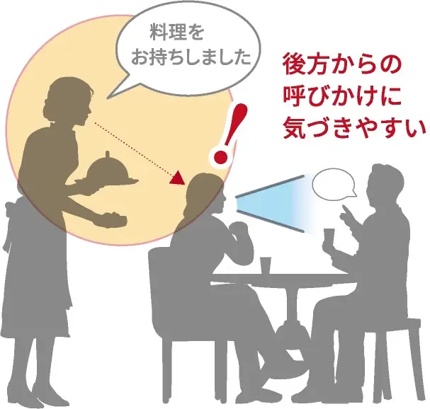 左右の補聴器が連携し、自動で周囲の状況を分析。環境に応じて、聞きたい音を最適な状態で届けます。目の前の会話に集中していても、後方からの声に反応できるようになります。