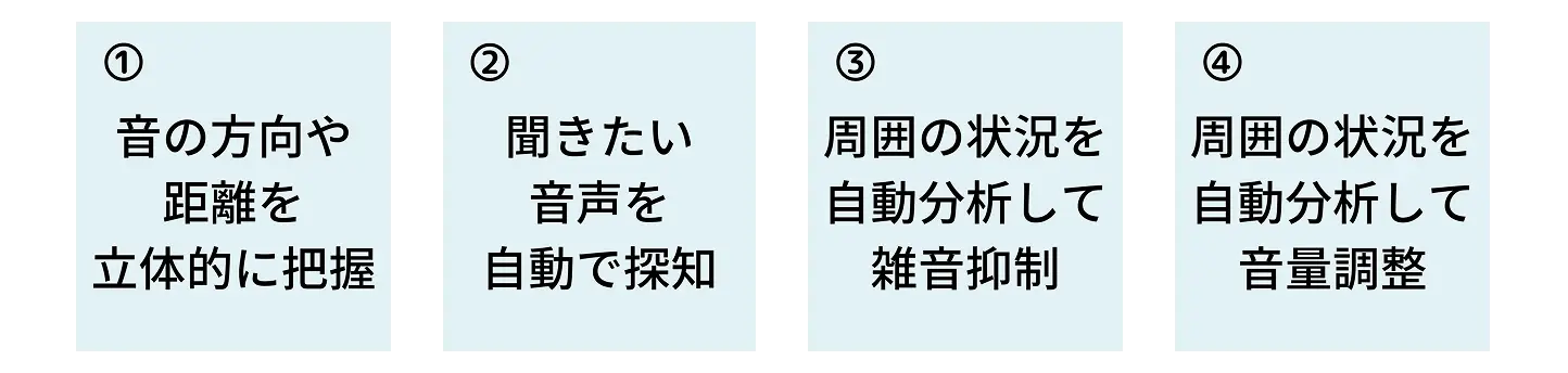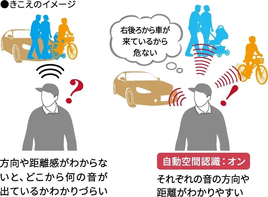空間を立体的に捉えることができ、話している人がいる方向や車との距離が分かりやすくなります。