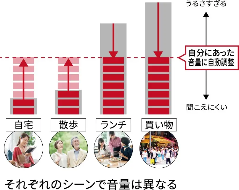 静かな環境では大きく、騒がしい環境では小さく音量が自動で調整さ