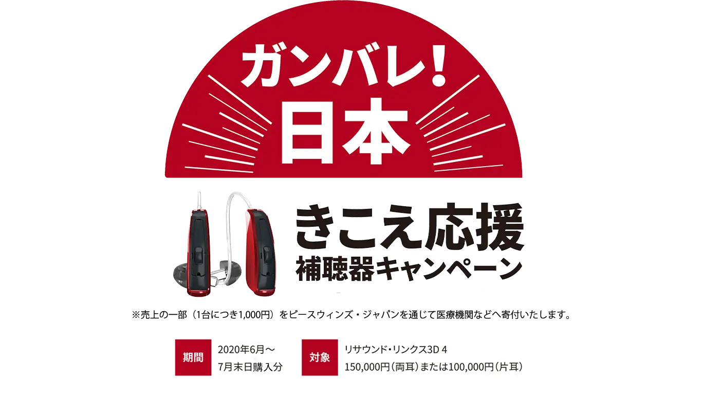また「最前線で新型コロナウイルス対策に尽力されている医療機関・福祉施設を応援したい」という思いをこめて、キャンペーン期間中に販売されたリサウンド補聴器対象製品の売上の一部(1台に付き1,000円)をピースウィンズ・ジャパンを通じて医療機関などへ寄付いたします。