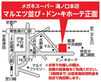 - アクセス 南武線武蔵溝ノ口駅、田園都市線溝の口駅共に出口は丸井側となります「駅を出まして丸井方面手前、ムサシボウルとドン・キホーテを目指して歩いていただきますとムサシボウルの左後ろ側、スターバックス、洋服の青山とマルエツの間を抜けた並び、ドン・キホーテ目の前の角に溝ノ口本店があります。」