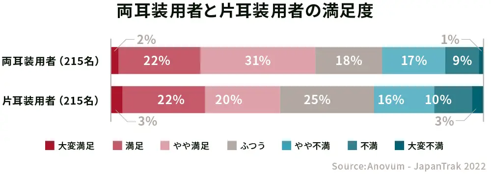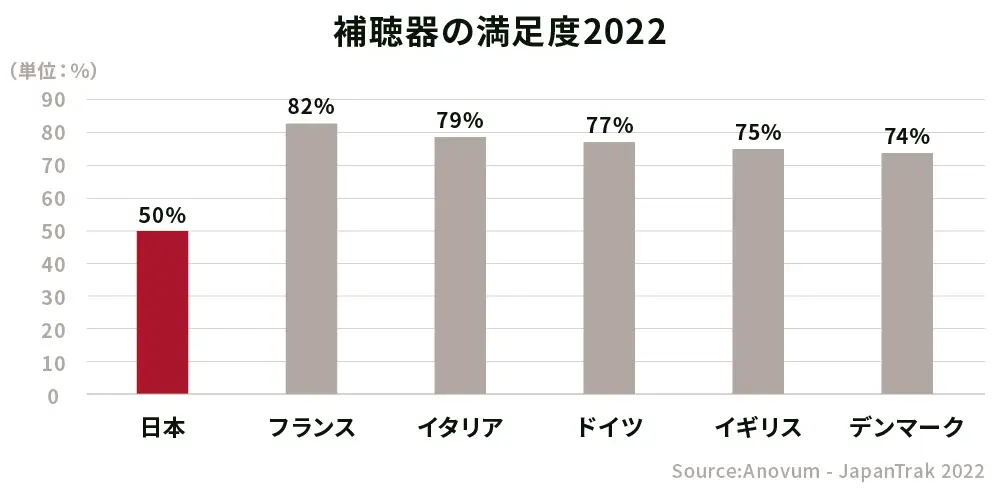 補聴器所有者における補聴器全体の満足度は2018年の38%と比べ、2022年は50%と改善はされていますが、日本の満足度は依然として欧州諸国の半分以下です。