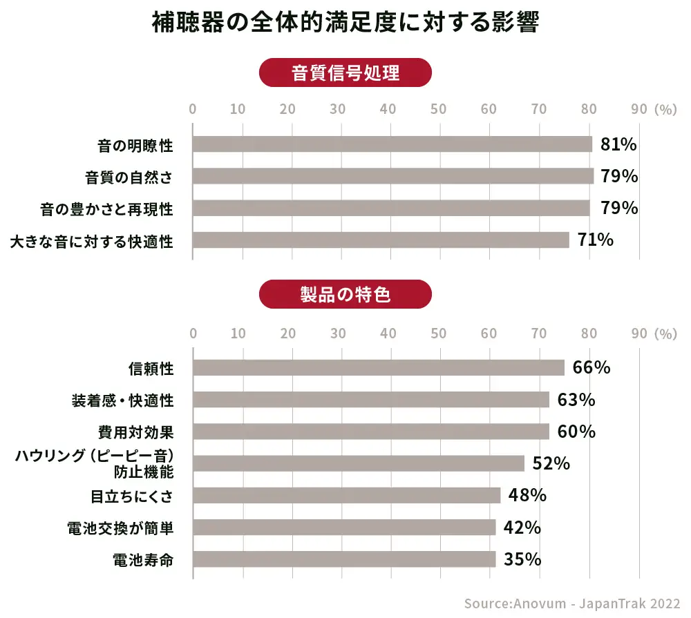 補聴器の満足度に対する影響度が高い項目は「音の明瞭性」「音質の自然さ」「音の豊かさと再現性」「大きな音に対する快適性」「信頼性」など、音質に関する項目が多く上がっています。
