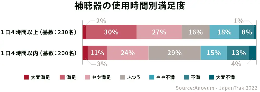 装用者の聞き取りの状況で特に満足度が低かったのは「騒がしい場所」「大きなグループでの会話」「大会場での講演内容の理解」でした。これらの状況は周りの騒音や反響音の影響で、聞き取りの難しい場面なので補聴器に慣れてから試すと良いでしょう。
